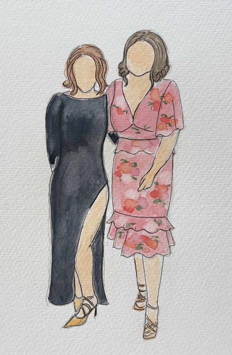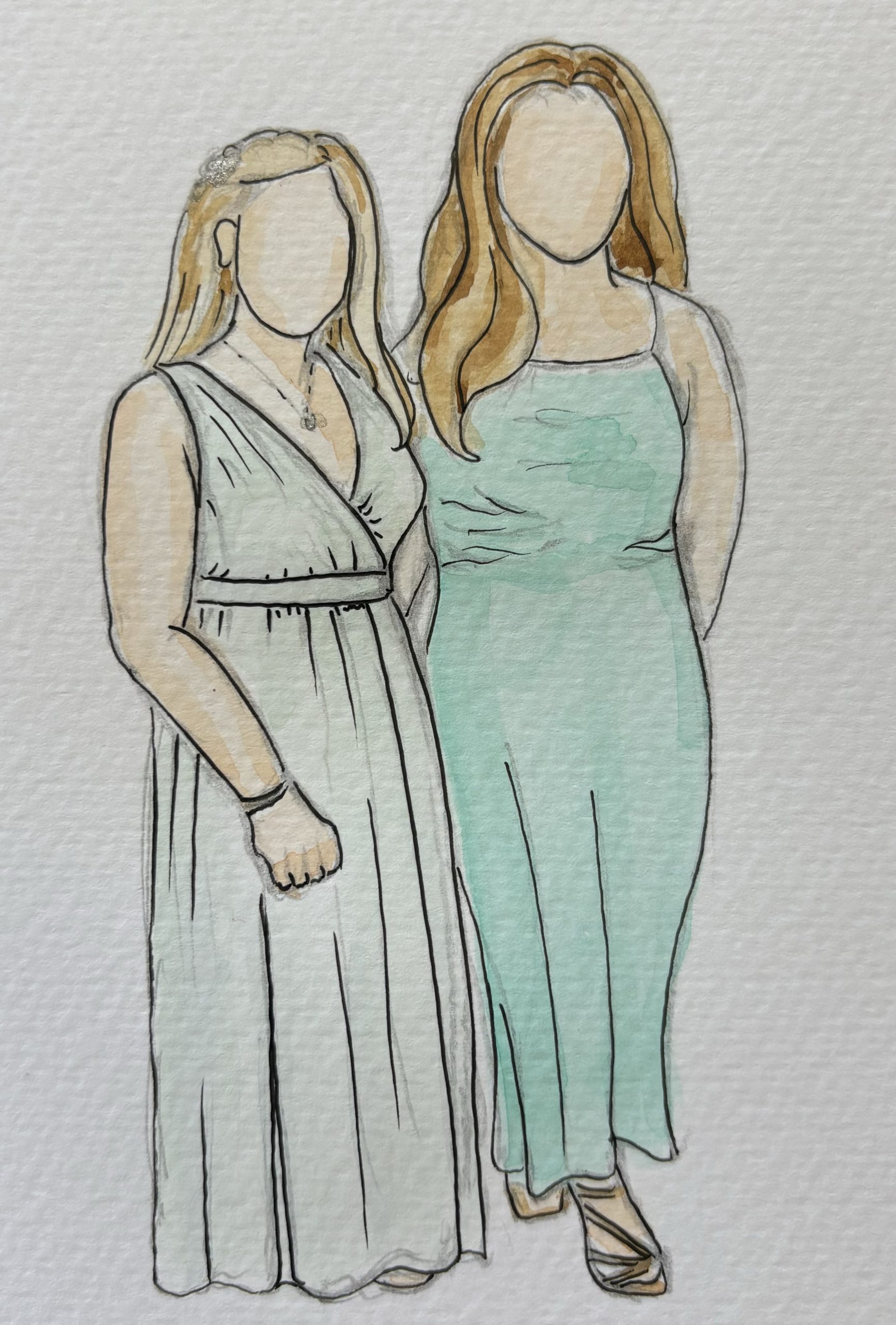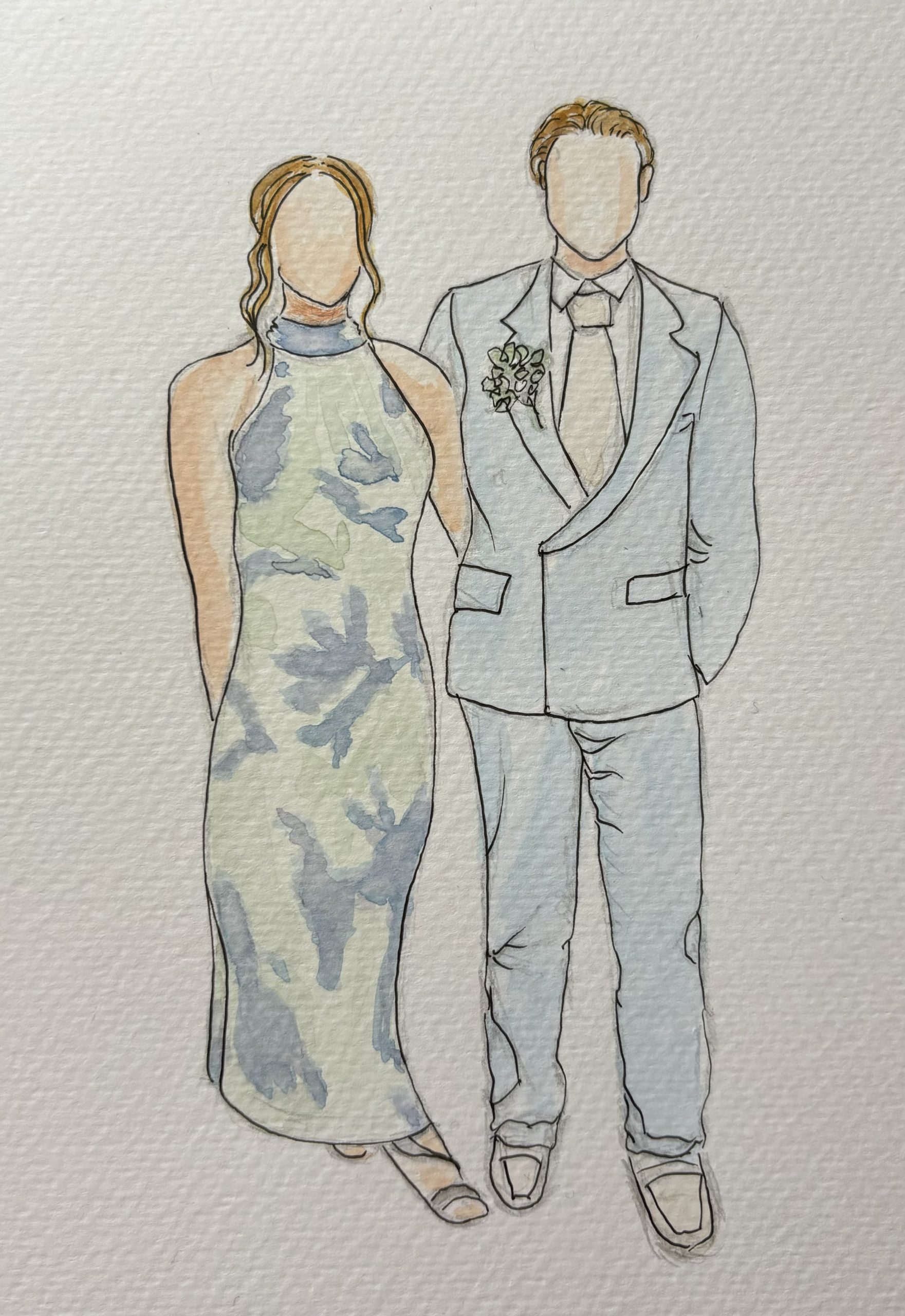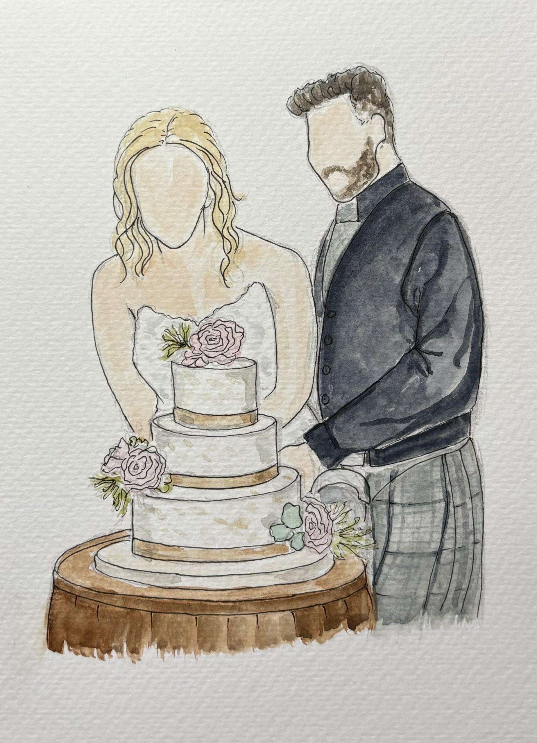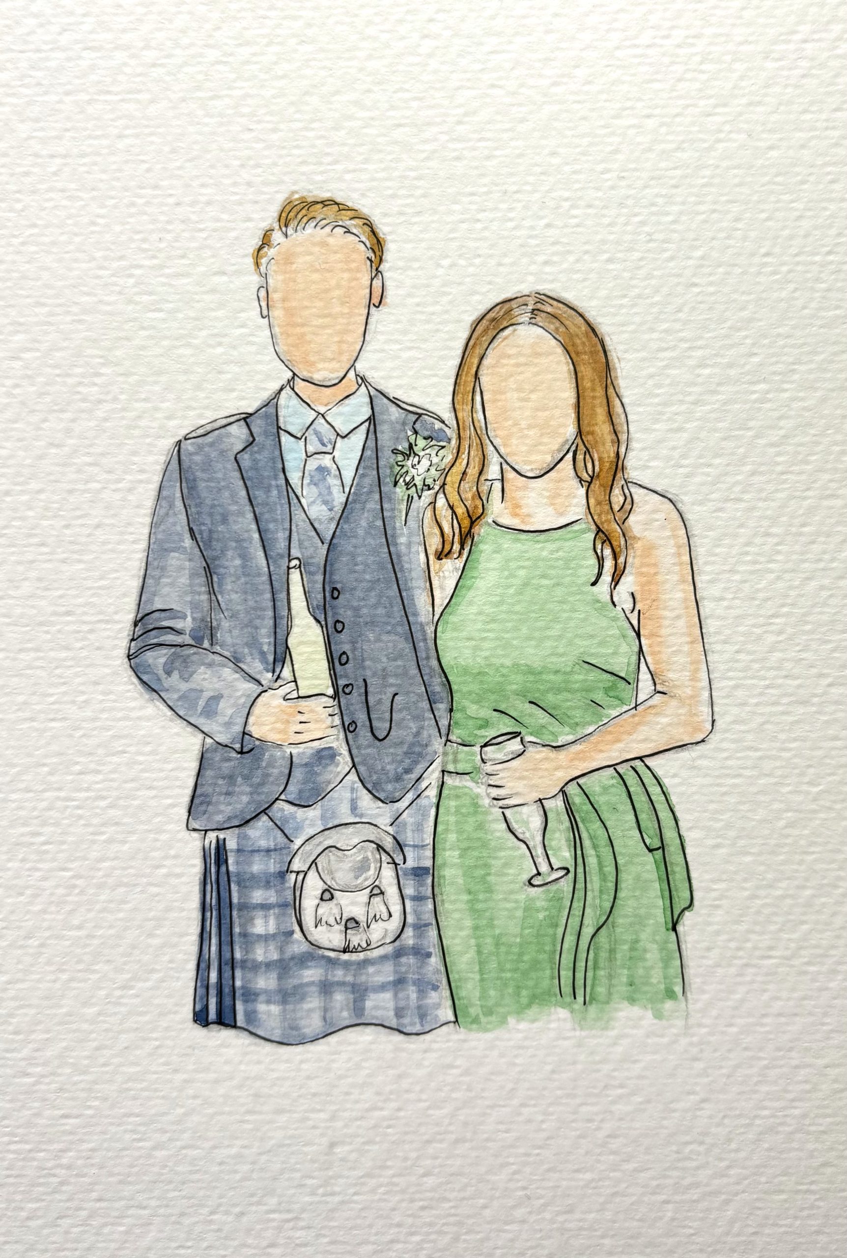 I offer three live illustration packages, depending on how long you’d like me to be part of your celebration — from a relaxed Reception Sketch during drinks, to a Celebration Experience covering key moments, or a Full Wedding Keepsake for a more immersive presence throughout the day. Each illustration is hand-painted in watercolour and presented as a keepsake for guests to take home.