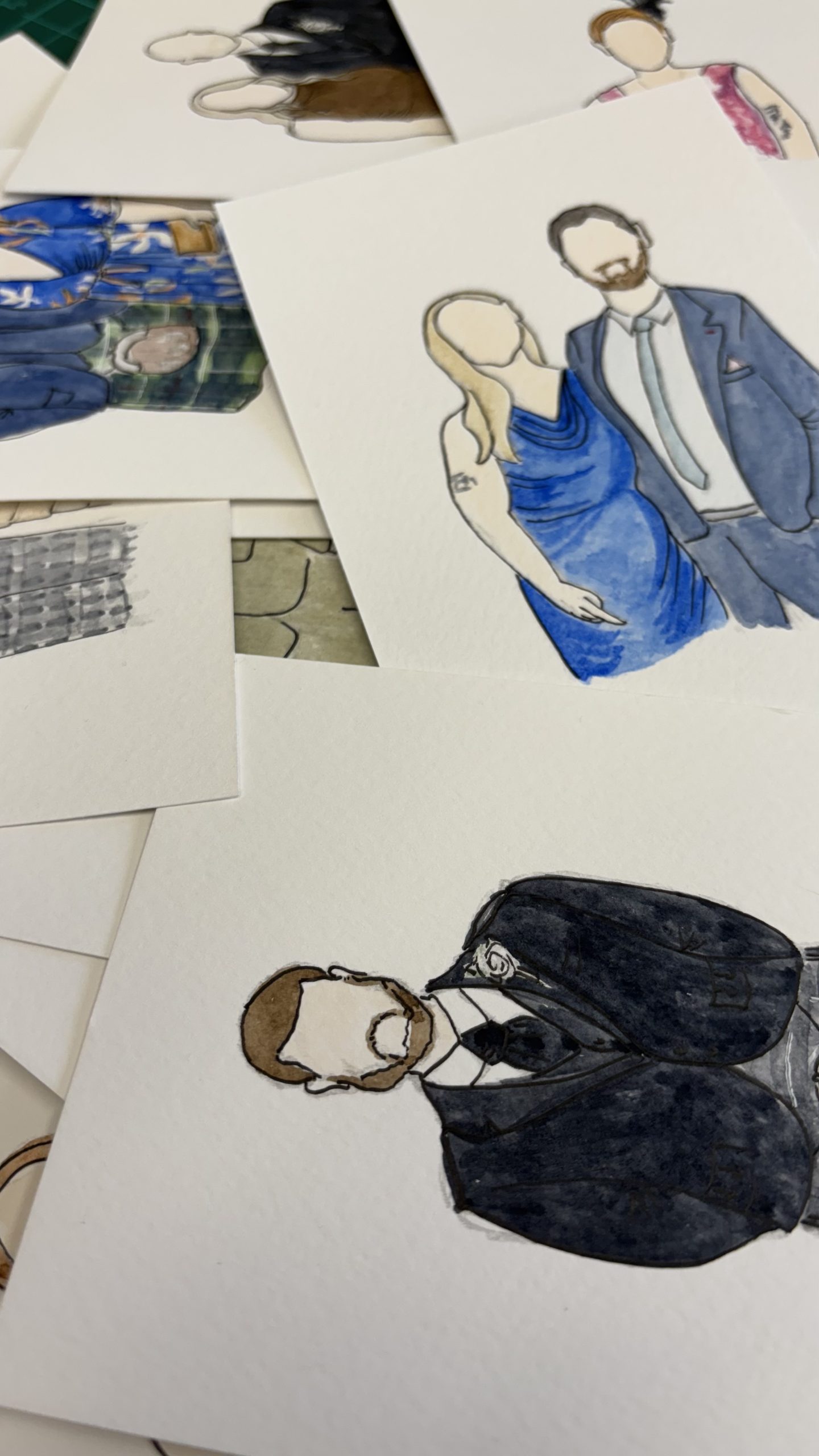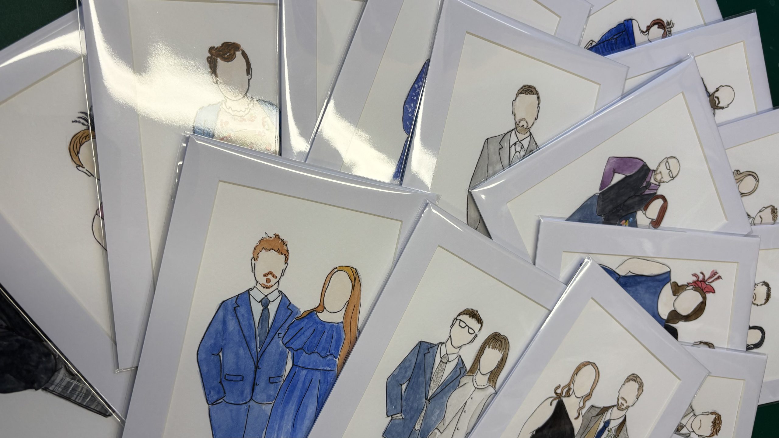 Live guest illustration creates beautiful keepsakes guests can take home — more like mini artworks than a quick favour. Painted in my signature faceless style, they offer a unique and memorable feature during your wedding day.